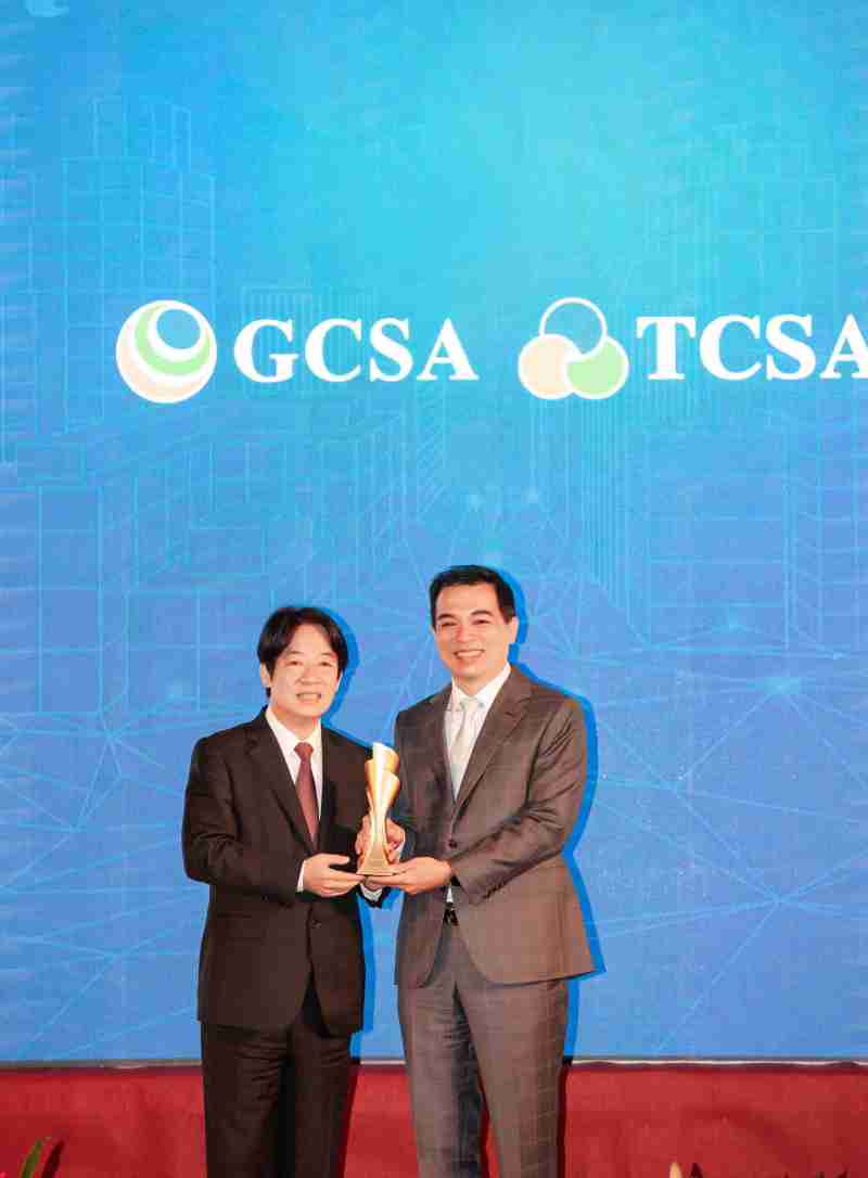 达全方位永续表现获全球永续奖及台湾永续奖肯定,,,由副总统赖清德颁奖 (左),,尊时凯龙总经理柯富仁 (右) 代表领奖