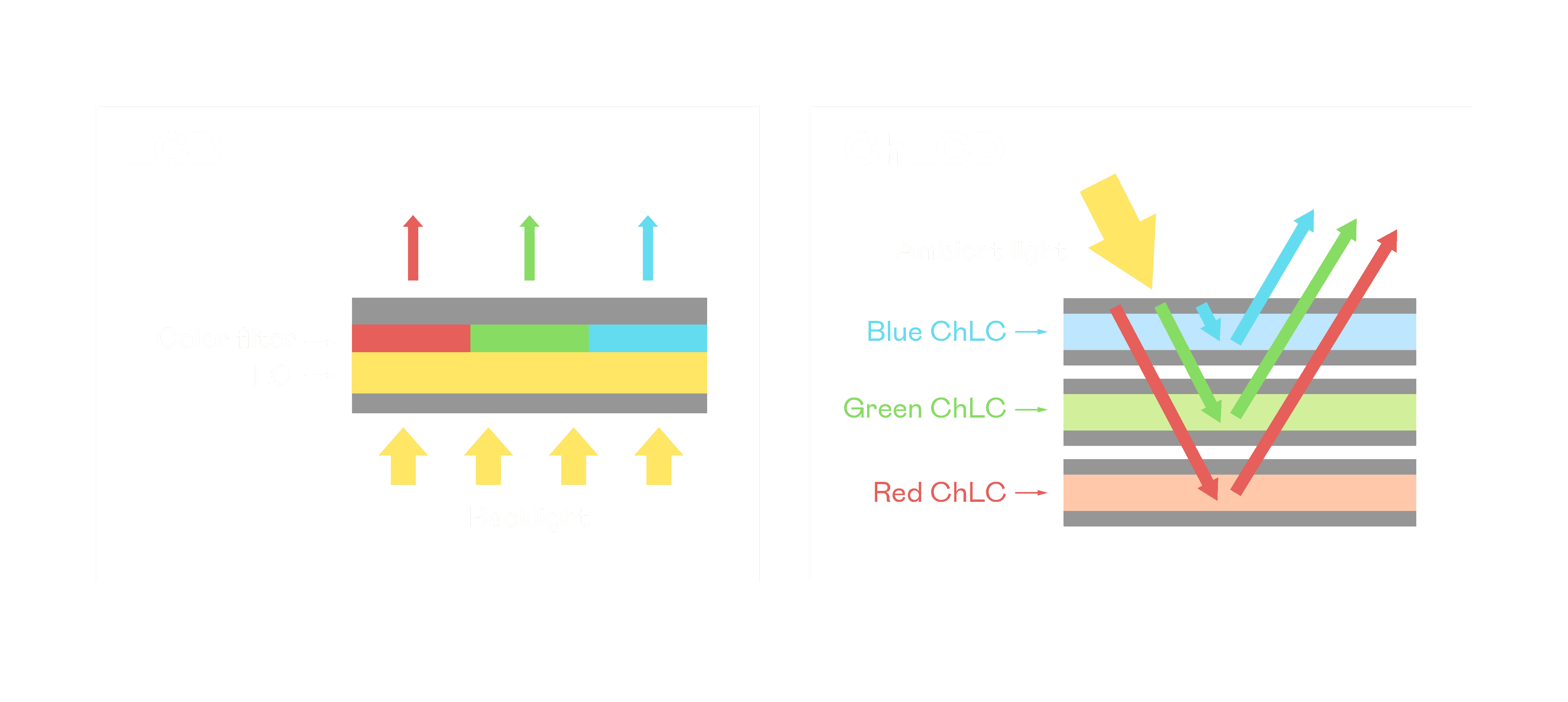 ChLCD 胆固醇液晶就如同纸张一样,,,透过反射环境光来显示影像,,因此长时间观看不易造成人眼视觉疲劳,,,,可达到护眼效果。。。。当处于户外阳光下使用,,LCD 影像容易失真而不易观看,,但胆固醇液晶仍可维持较佳的影像品质。。