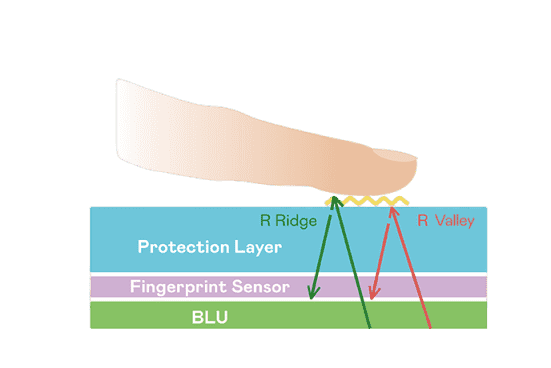 TFT 指纹扫描感测技术利用薄膜电晶体 (TFT) 当作光感测元件,,藉由非晶硅 (a-Si) 与低温多晶硅(LTPS)既有光电转换特性对不同波段光源进行吸收,,,,使感测 IC 读取阵列感测元件的光漏电差异,,,,转换成数位灰阶影像。。。