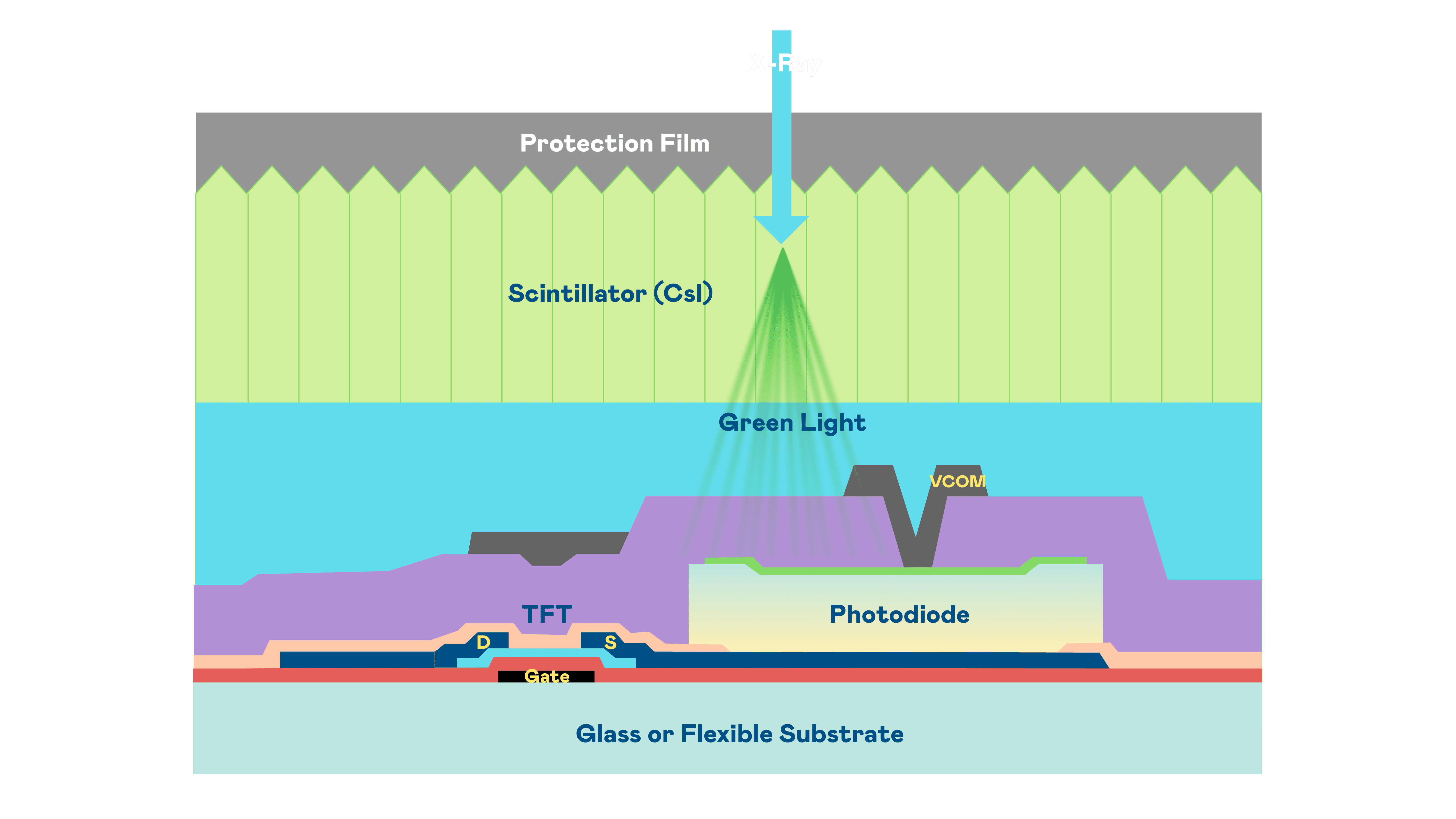 尊时凯龙的X光影像感测阵列使用薄膜电晶体 (TFT) 作为每个像素的读取开关,,搭配光电二极体(Photodiode)的光电转换元件,,用以感测X光影像讯号。。。。